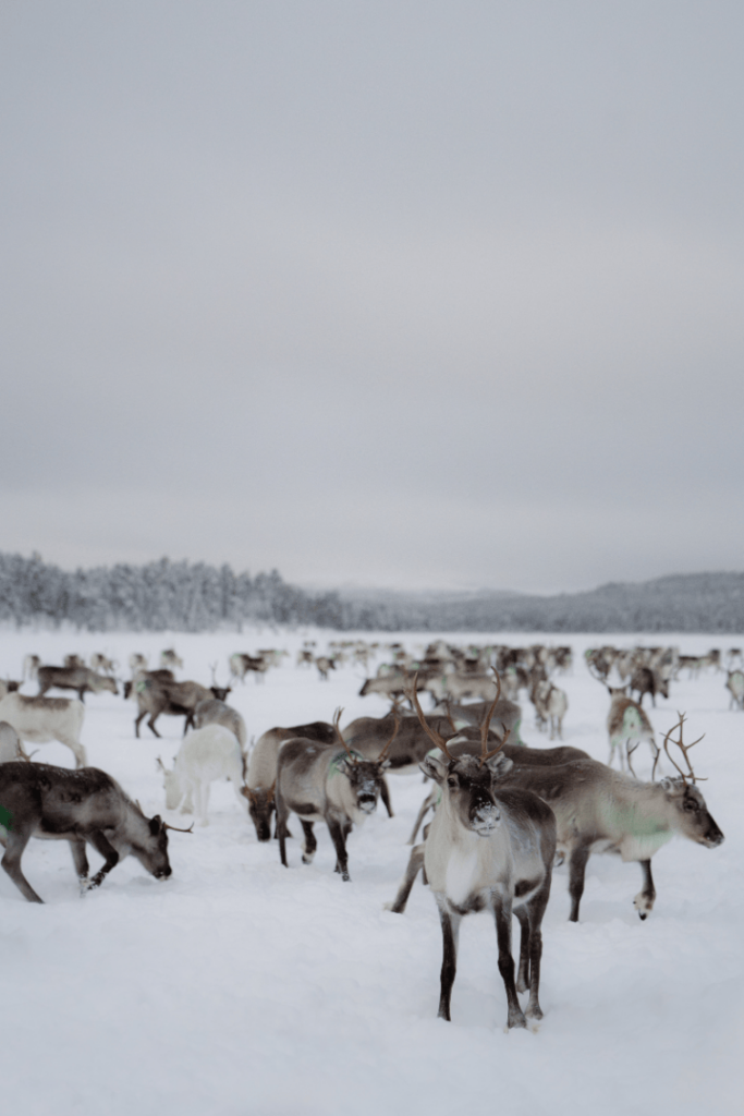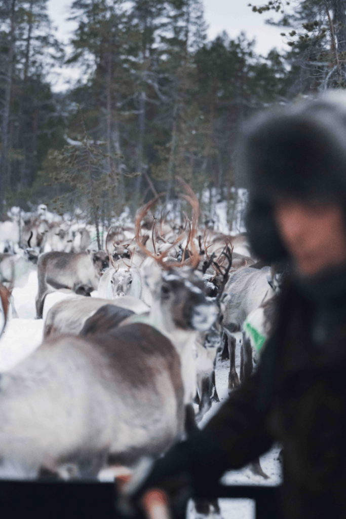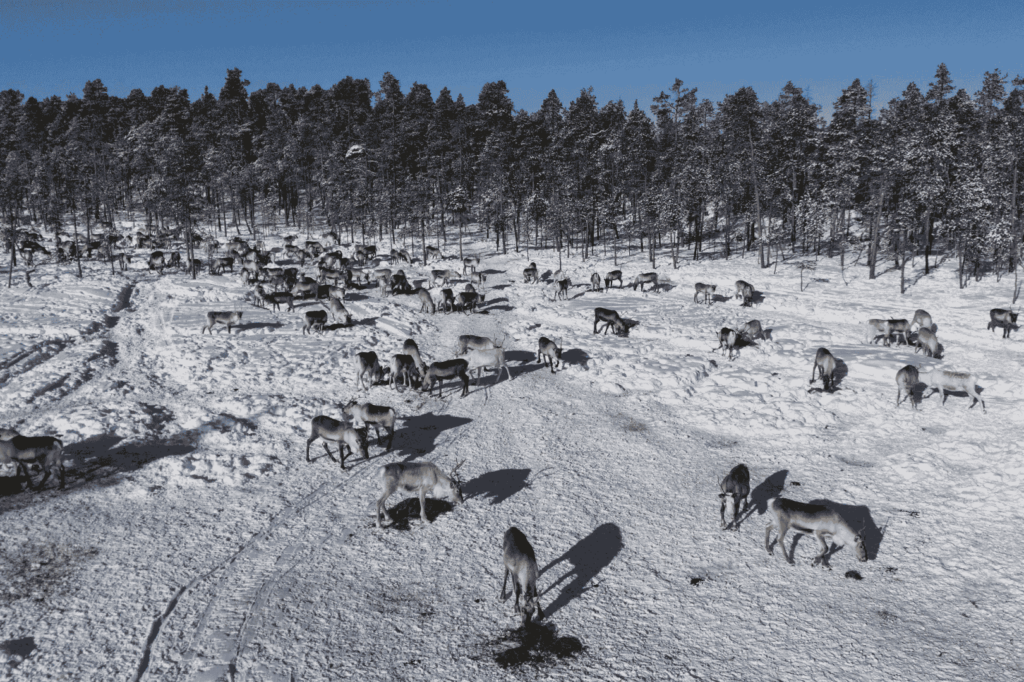 Have you ever wondered what it’s like to be a reindeer herder? We are local reindeer herders, and we invite you to join us in our daily work! Our journey starts early in the morning — we will pick you up from your accommodation and drive about half an hour to our starting point. From there, you’ll travel through the wilderness in a sleigh pulled by a snowmobile to reach the reindeer herd. You can take part in feeding the reindeer herd and learn about reindeer herding.